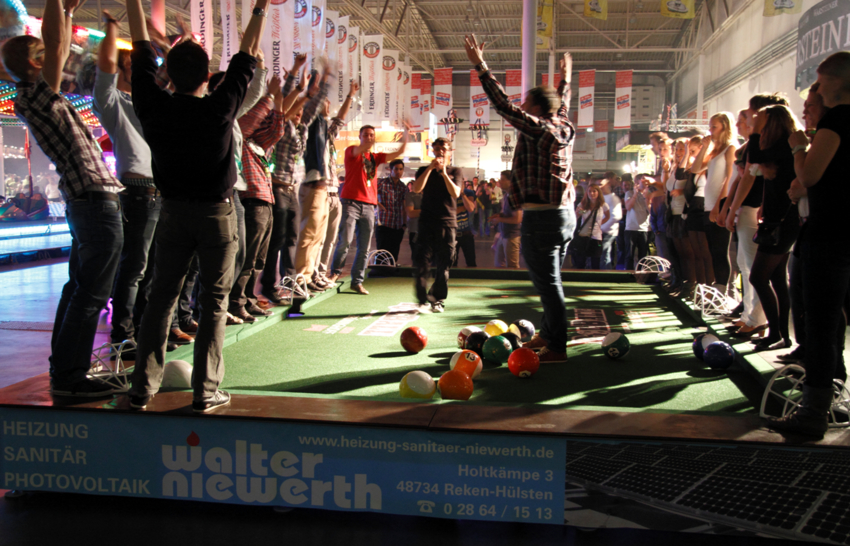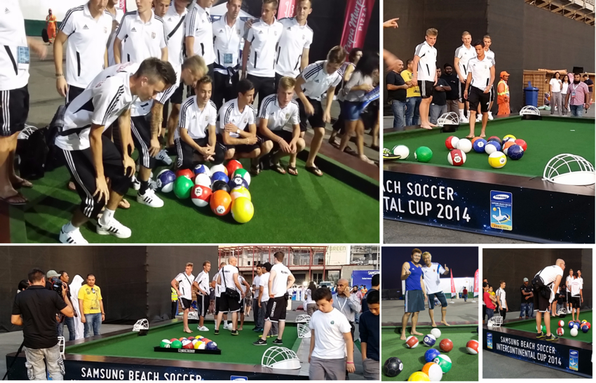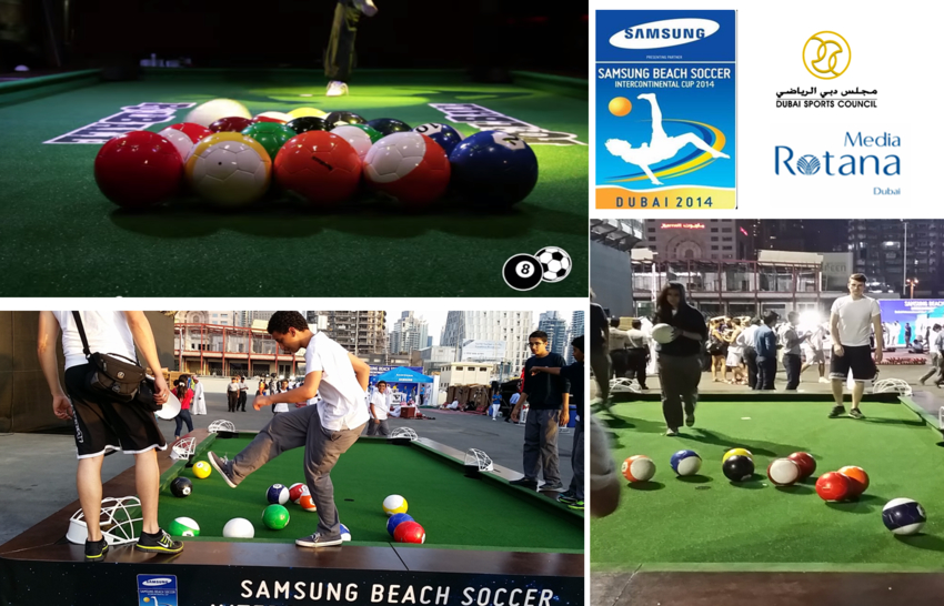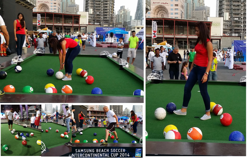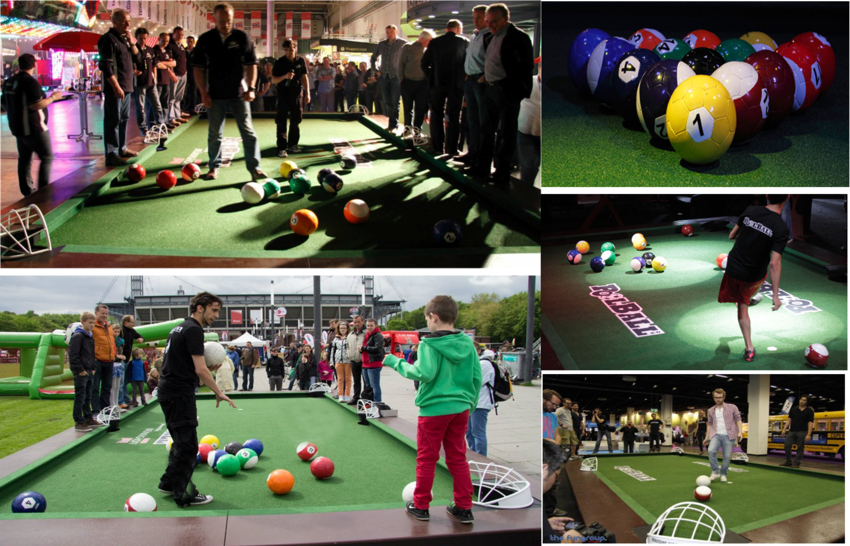 PoolBall is an innovative concept, the game is combination of pool and soccer , the game is full of fun, excitement, it is played by foot between two players / teams on a giant billiard board, no limitations to age groups. PoolBall can be played outdoor or indoor facilities, PoolBall event can include competitions and tournaments between teams.